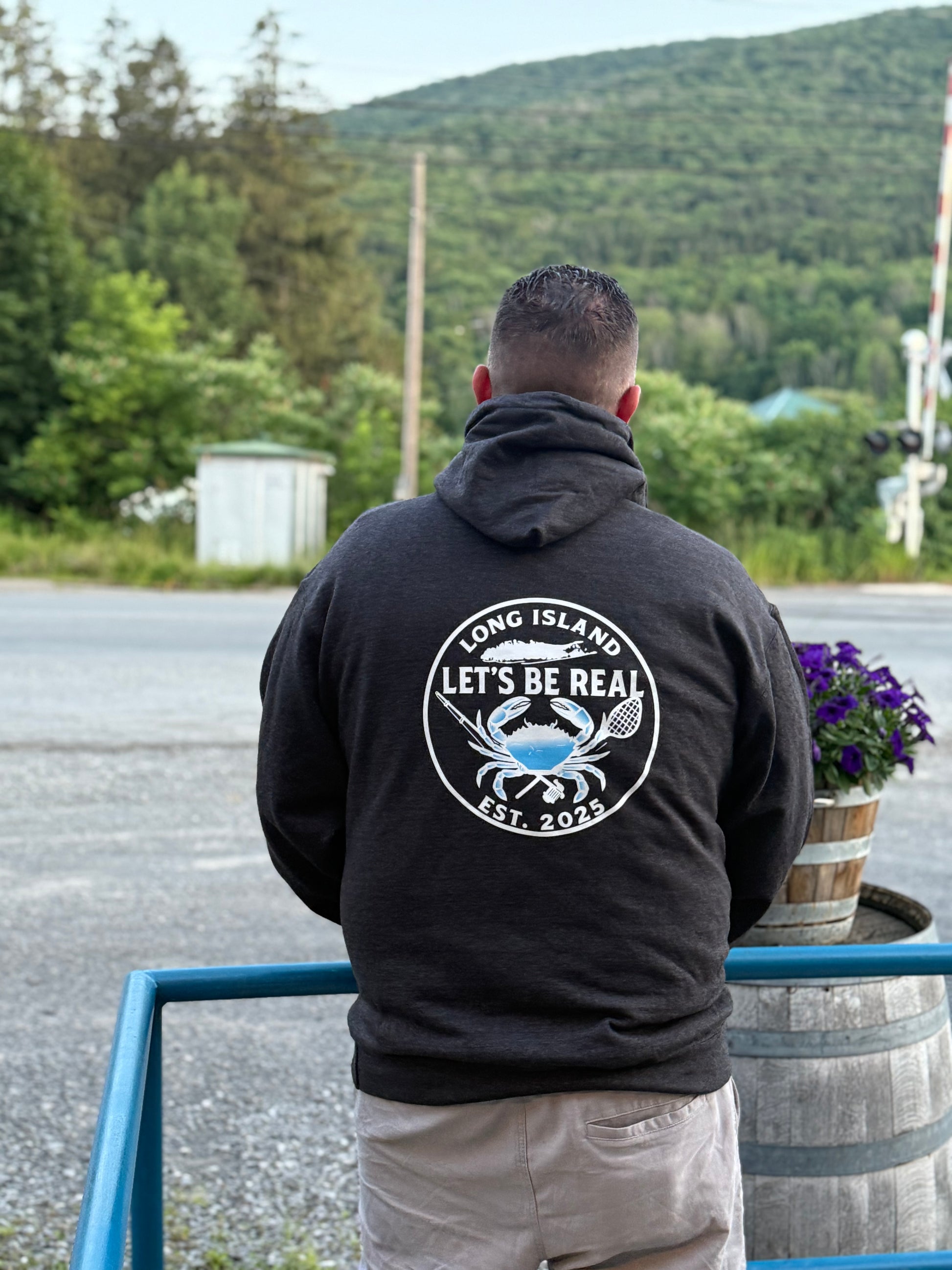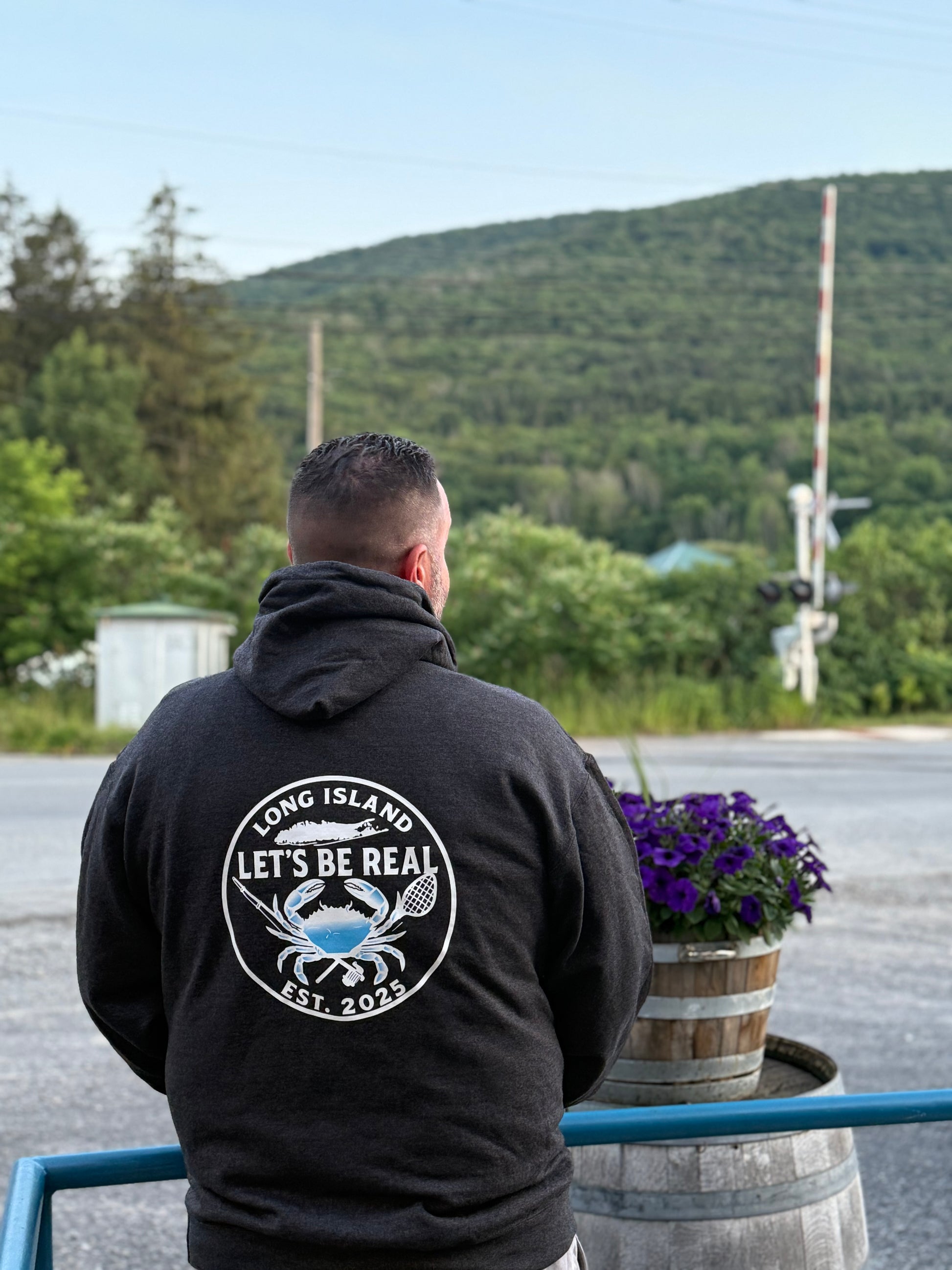 Keep it cozy and coastal with our Long Island Hooded Sweatshirt, featuring a custom logo with a crab and the phrase “Let’s Be Real.” This soft, comfy hoodie brings laid-back vibes with a touch of local pride—perfect for beach days, bonfires, or just lounging with friends. Show off your love for Long Island and real talk, all in one go.